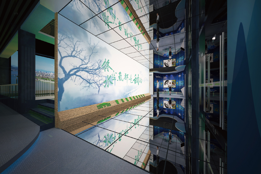 修水旅游规划展示馆整体设计风格突出立体和灵秀,展现出修水丰富的旅游资源。以当地著名景点修河为地面设计元素,蜿蜒贯穿整个展馆,以顺时针方向进出,依次讲述修水的文化旅游文化、旅游物产和旅游战略,徜徉其上的参观者能够亲身感受修水旅游业的崭新风貌。